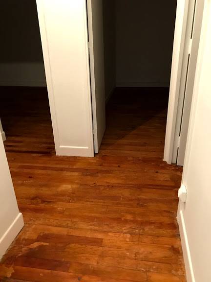 Il a fallu dans un premier temps poncer l'intégralité des parquets et l'escalier pour revenir sur un bois brut.